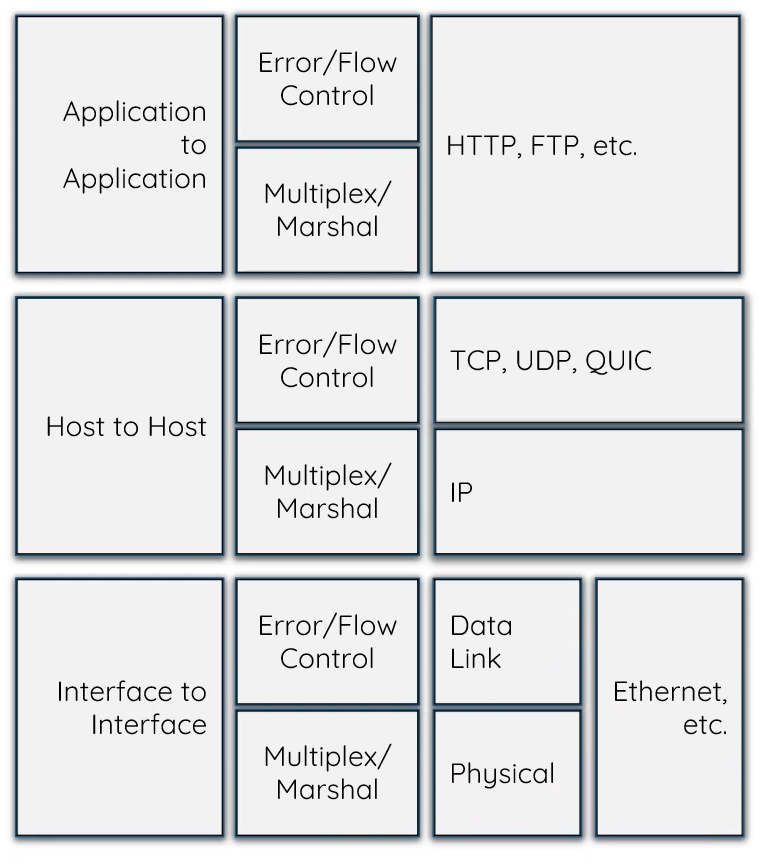 - RINA model = Recursive InterNet[work] Architecture (application, host, interface level):