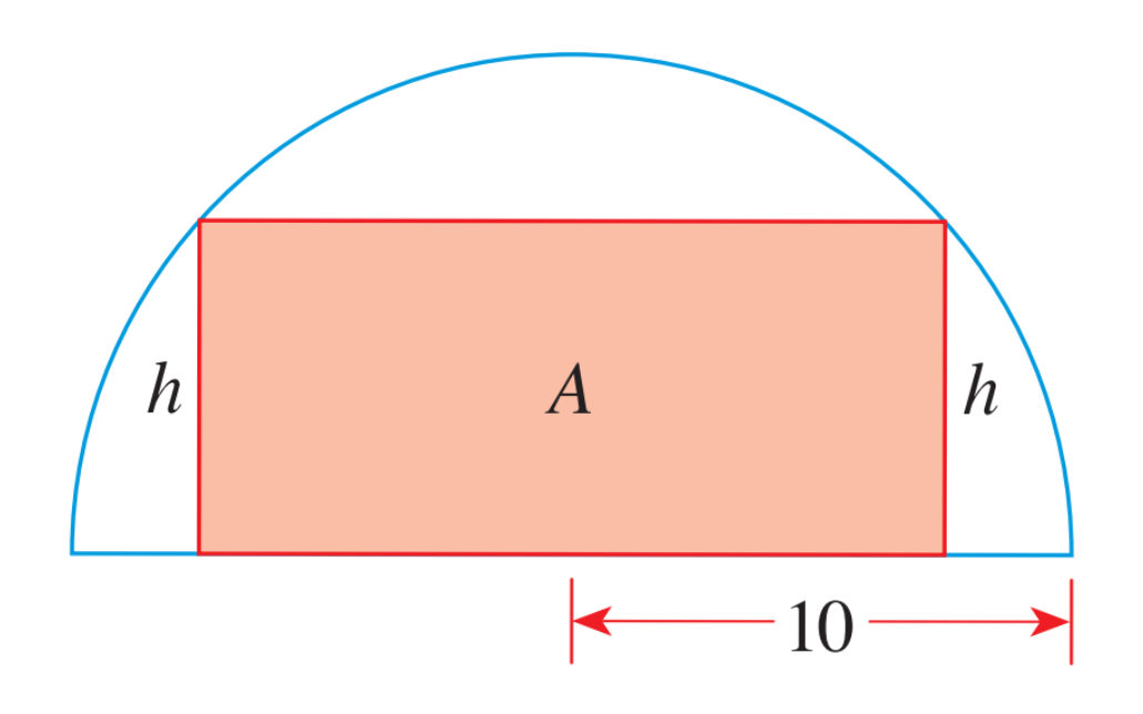 6. A rectangle is inscribed in a semicircle of radius 10, as shown in the figure below. Find a function that models the area A of the rectangle in terms of its height h.